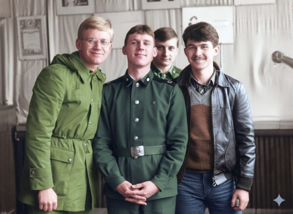 На фото: в гости к проходящему действительную военную службу отъявленному инязовцу рядовому-частнику* Эриху Ольхе (Erik von Olcha, г/у 1983–1990) с внезапной проверкой-инспекцией приехали бывшие однокурсники Валерий Корсаков (слева, г/у 1983–1988) и Виктор Радивиновский (справа, г/у 1983–1988).